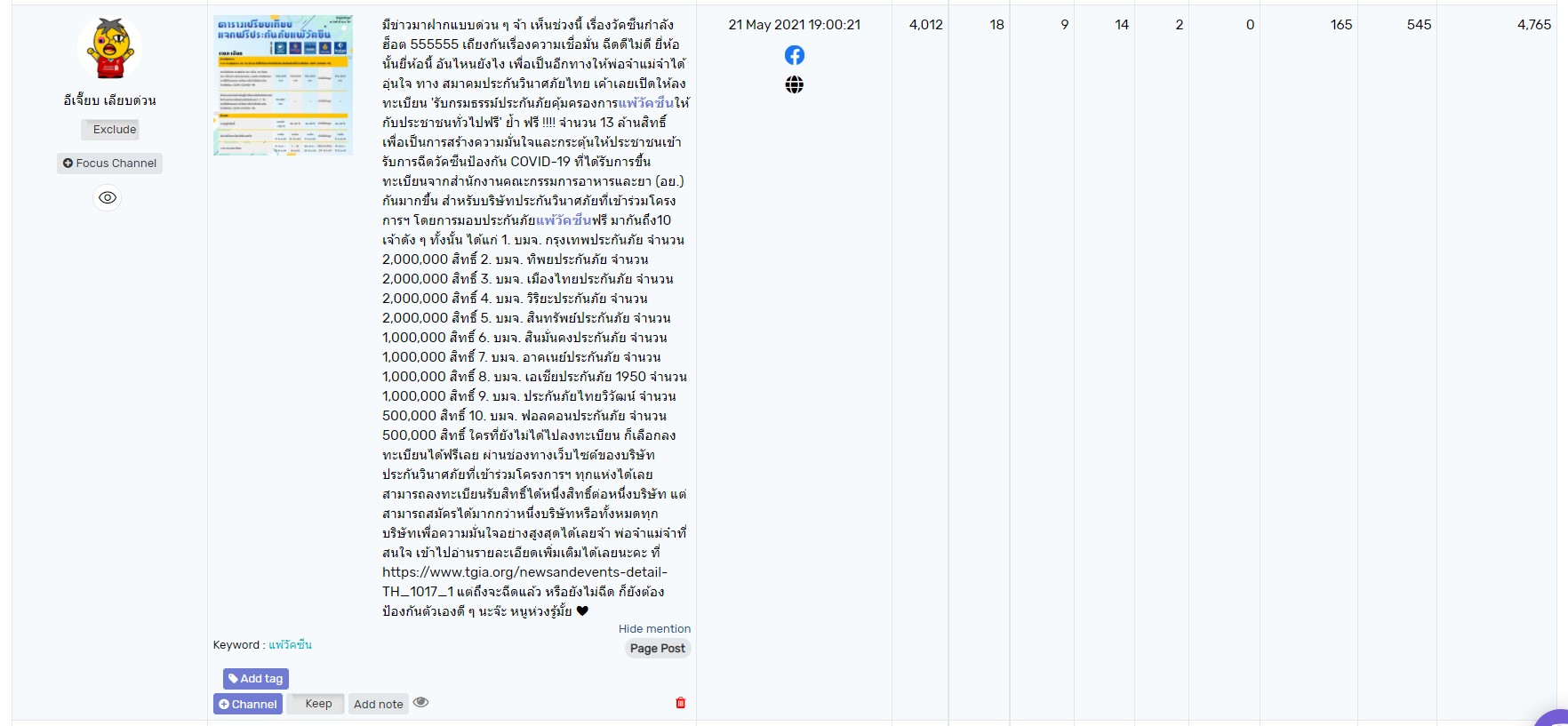 ข้อมูลมีเยอะมากทั้งการเมือง,การด่ารัฐบาล,การขายประกัน อื่น ๆ แต่ เราใช้ข้อมูลที่กรองมาจาก Social Data แบบเร่งด่วนทำให้เราเข้าใจได้แล้วว่าก่อนเตรียมตัวทำอย่างไร , ถ้ามีอาการแพ้วัคซีนดูแบบไหน เบอร์ติดต่ออะไรที่ควรจะมี , และ อย่างหลังสุดประกันภัยฟรีควรจะทำไว้ ไม่เสียหาย