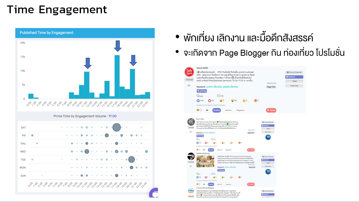 นักวิเคราะห์ส่งต่อข้อมูลให้กับนักการตลาด สำหรับร้านค้าที่ Post ส่วนใหญ่จะ Post ในเวลาช่วง 11 โมง แต่การเกิด Engagement หรือการมีส่วนร่วมนั้นจะเกิดหลากหลายเวลา และ Page ไหนที่คนส่วนใหญ่ให้ความสนใจ