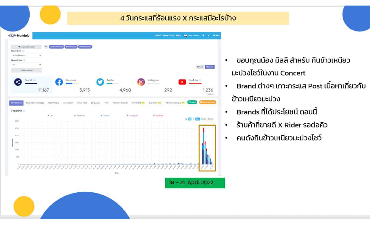 ก็สรุปออกมาใน Social data ว่ากระแสที่ร้อนแรงที่เกิดขึ้นจาก soft power ใน Coachella ระดับโลกส่งผลให้น้องมิลลิ และ ข้าวเหนียวมะม่วงสร้างกระแสต่อเนื่องส่งผลให้ร้านขายข้าวเหนียวมะม่วงนั้น ขายดีเป็นอย่างมาก มีการพูดคุยกันแบบไหนบ้าง