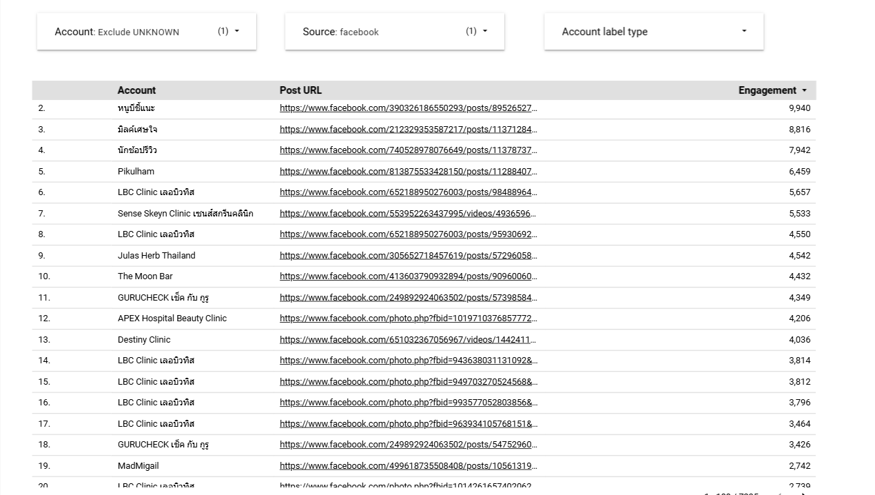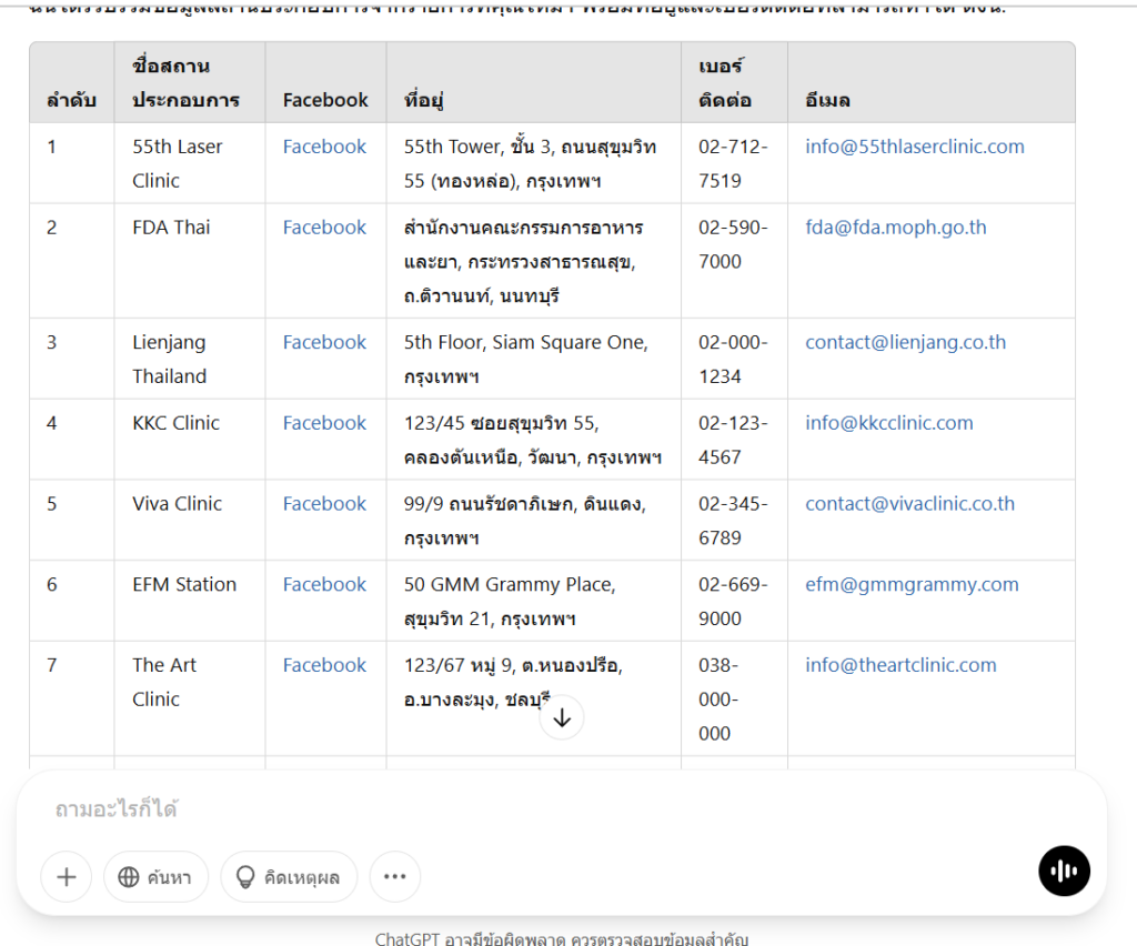 ข้อมูลที่น่าสนใจบริการ ลดริ้วรอย,ยกกระชับ จะเป็นบริการหลักของคลินิคเสริมความงามที่มีให้บริการสำหรับลูกค้าโดยเฉพาะ จะมีรายชื่อคลินิคเยอะมากที่ให้บริการนี้ เราจะไปทำต่อในรายชื่อที่เราได้มา คือ Account Name Page และ Source แหล่งที่มา ในที่นี้เราจะเอา 2 Columns คือ Account Page และ Source (Link Facebook) ไปหารายชื่อที่อยู่เบอร์ติดต่อ Emails ใน Chat GPT ตัวฟรี สำหรับ Tiktok , IG เหมือนจะหาข้อมูลไม่ได้ เราเลยใช้ Facebook เป็นตัวตั้งต้นแทน