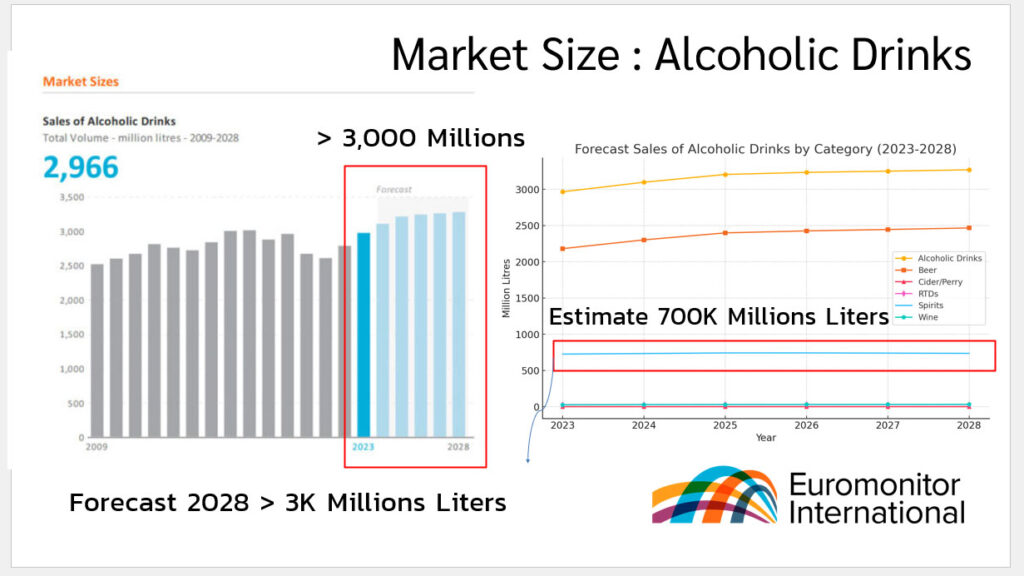 ปี 2023 ตลาดสุราในประเทศไทยมีปริมาณการขายรวมอยู่ที่ 727K ล้านลิตร เพิ่มขึ้น 3% จากปีก่อนหน้า โดยมี Thai Beverage PCL ครองส่วนแบ่งตลาดสูงสุดถึง 80% ทั้งในแง่ปริมาณและมูลค่า