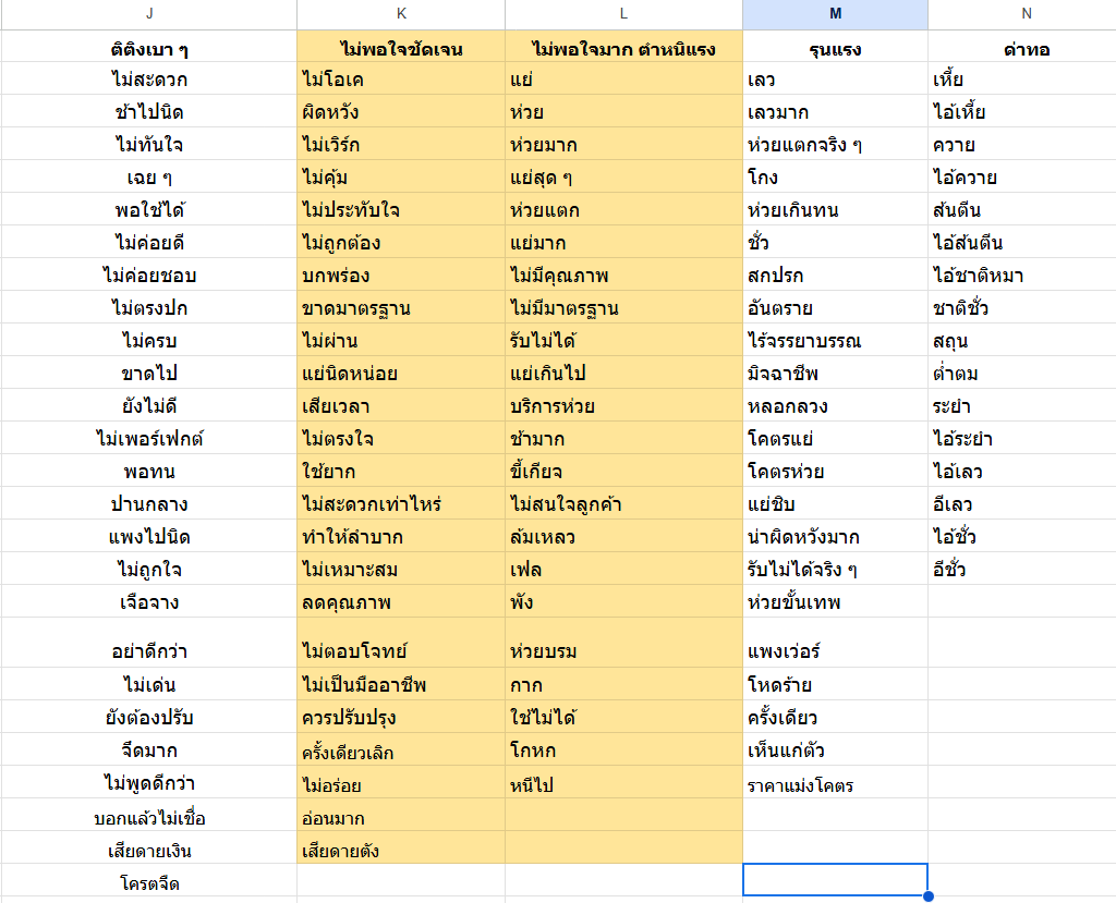 การวิเคราะห์ จะไม่ลงไปที่ Positive | Negative นะ แต่จะแยก สิ่งที่ลูกค้า Comment ที่ไม่ชอบออกมาเป็น 5 Levels แล้วเขียนสูตรจับคำ