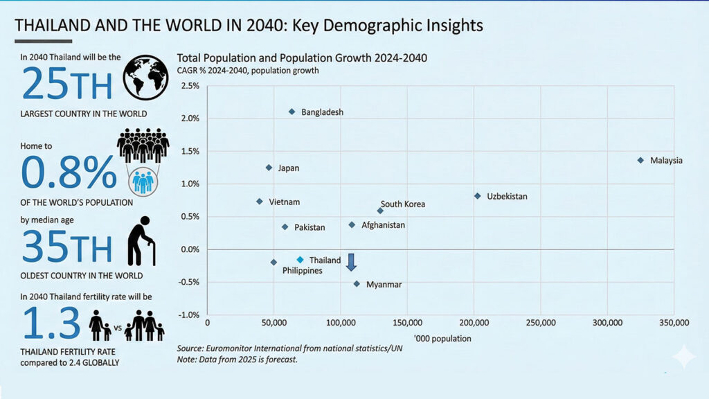 ปี 2040 ประเทศไทยกำลังเผชิญหน้ากับการเปลี่ยนแปลงทางประชากรศาสตร์ครั้งใหญ่ ซึ่งเป็นทั้งโอกาสและความท้าทายสำหรับธุรกิจและนโยบายภาครัฐ แก่นของเรื่องคือ “ประชากรที่หดตัว” และ “การเข้าสู่สังคมสูงวัยอย่างสมบูรณ์”