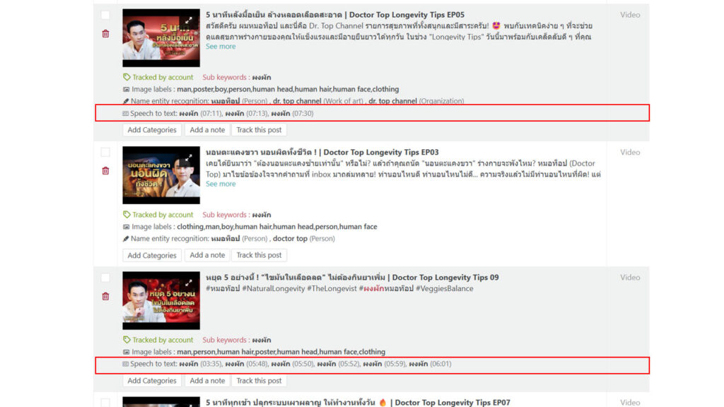 Keywords ที่เราสนใจ “สินค้า,คำพูดที่สื่อถึงบริการ” ในการ Tie in ของการทำเนื้อหา Contents ของ Influencer | KOL ถ้าพูดถึงช่วยบอกว่าอยู่ในนาทีที่เท่าไหร่ เพื่อลดขั้นตอนในการดู Video ทั้งหมด (ถ้าทีมงานต้องส่ง Report ด้วยรูปภาพและ นาทีที่พูด) มาดูตัวอย่างกัน