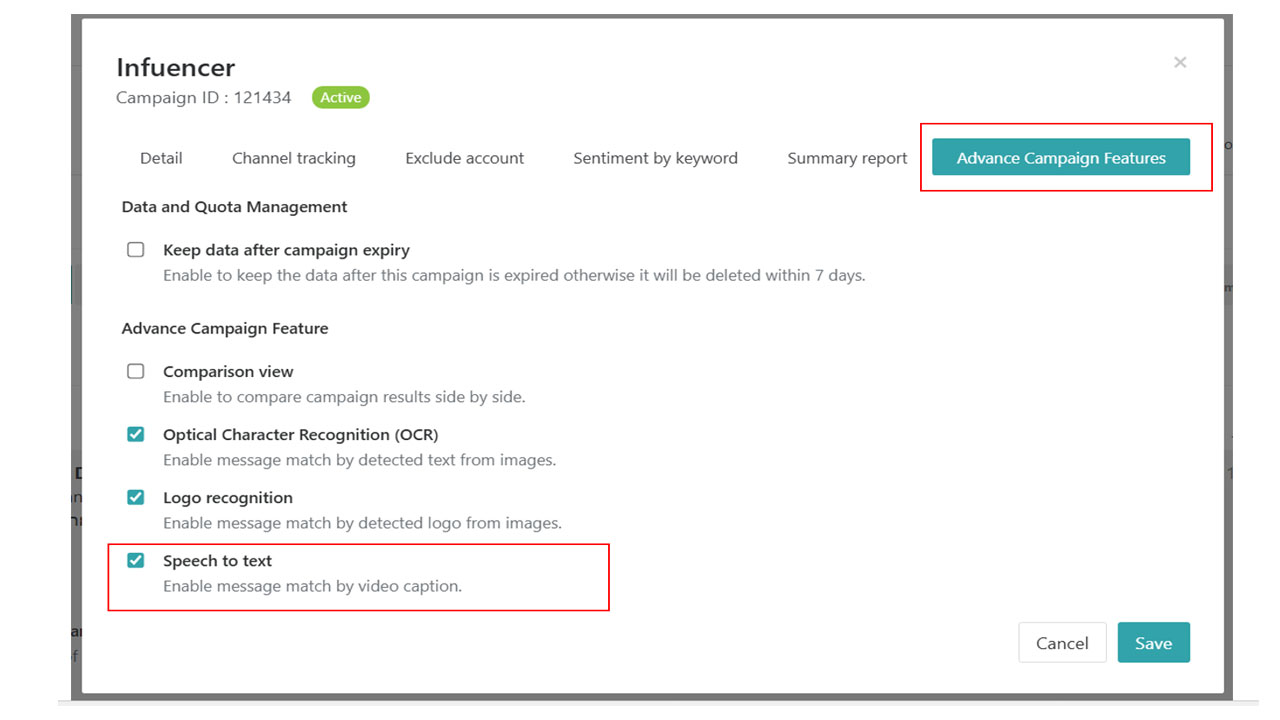 การใช้งานเพื่อดึง Data จาก Social Data เช่น ช่องทาง YouTube นั้น ยังคงแนะนำ ZOCIAL EYE เช่นเดิมซึ่งในราคาเริ่มต้น 3,000 บาท ต่อเดือน ก็สามารถใช้งาน Feature นี้ได้ ทันที โดยการไปเปิด Functions นี้ในการตั้งค่า Advance campaign features