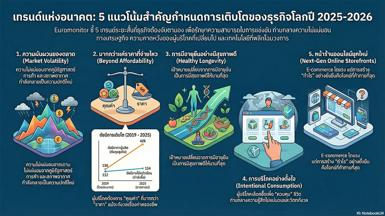 ปี 2026 มาดูปัจจัย 5 แนวโน้มหลักที่จะขับเคลื่อนธุรกิจให้เติบโตและสามารถแข่งขันได้ ถอดบทความ และ Podcast จาก Euro monitor Global Research firm มาสรุปให้เผื่อเป็นประโยชน์สำหรับนักการตลาดในการวางแผนธุรกิจที่ดุเดือด
